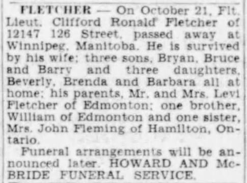 Son of Levi and Mary Agnes (nee Bramwell) Fletcher of Edmonton, Alberta. Husband of Edith Clements (nee Welsh) Fletcher and father of Beverly, Bryan, Bruce, Branda, Barry and Barbara Fletcher of Edmonton, Alberta. Brother of William, Francis, James, Freddy and Irene.