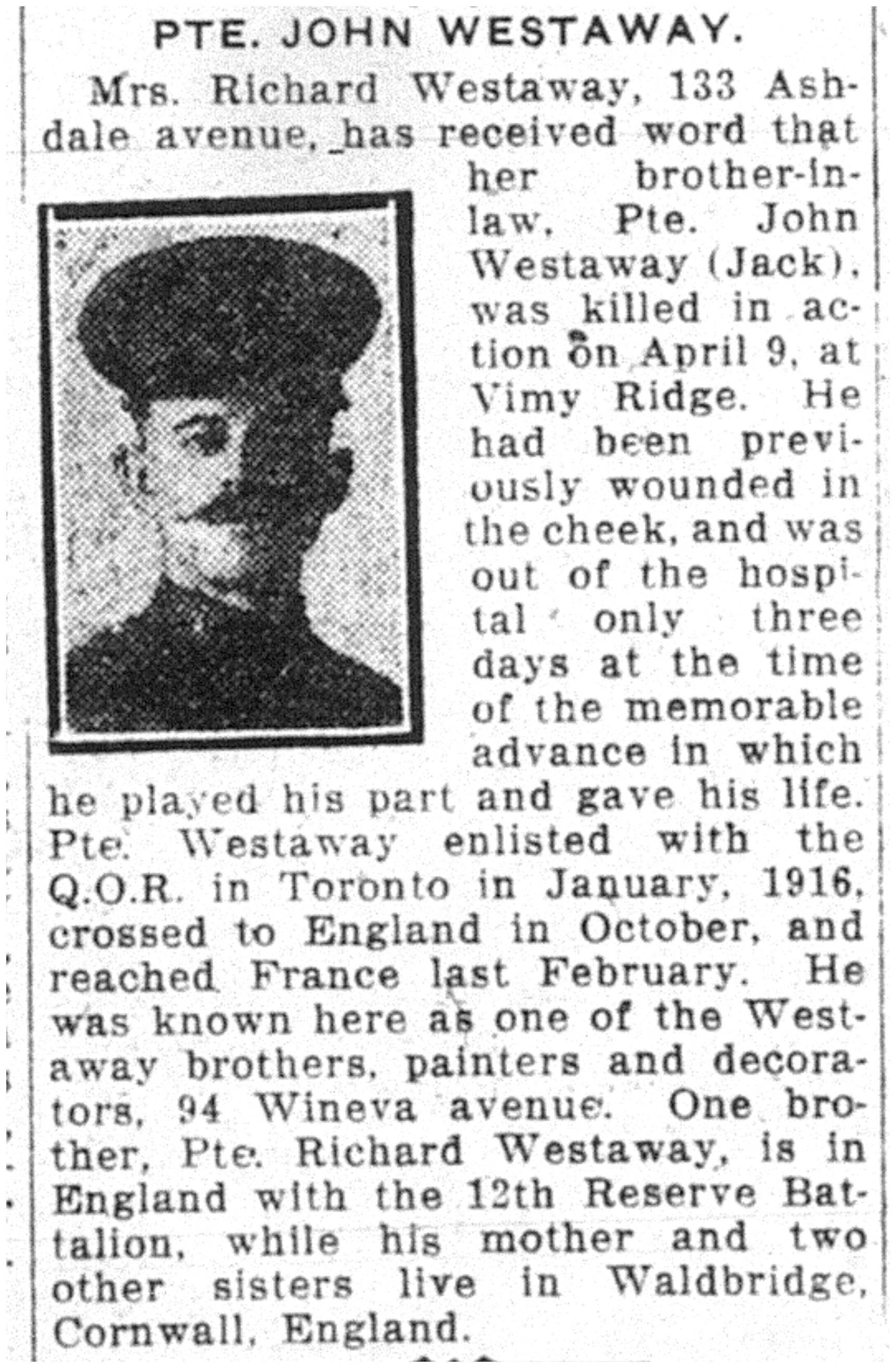 Son of Mr. and Mrs. J. Westaway, of Wadebridge, Cornwall; brother of Richard Westaway, of 31, Glen Rd., Wadebridge, Cornwall.