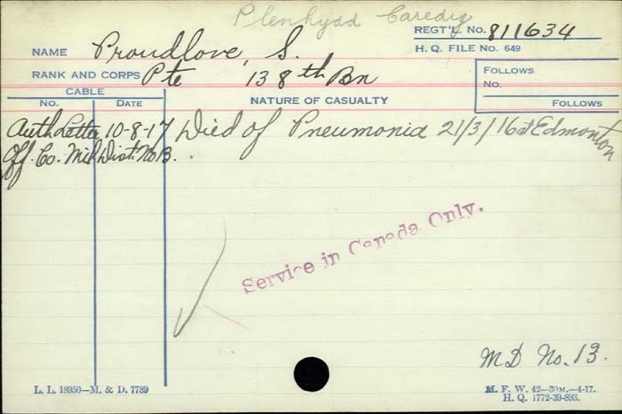 Son of Joseph and Alice Proudlove, of Westlock, Alta.