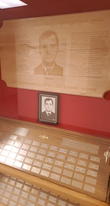 The M/Cpl JL Pierre Lacoste memorial award is presented to the outstanding student on the Trade Qualification Level Three Traffic Technician Course. Master Corporal Lacoste is also commemorated on the Memorial to Loadmasters who lost their lives in service. The Memorial is located at RCAF Memorial Museum at Trenton, Ontario.