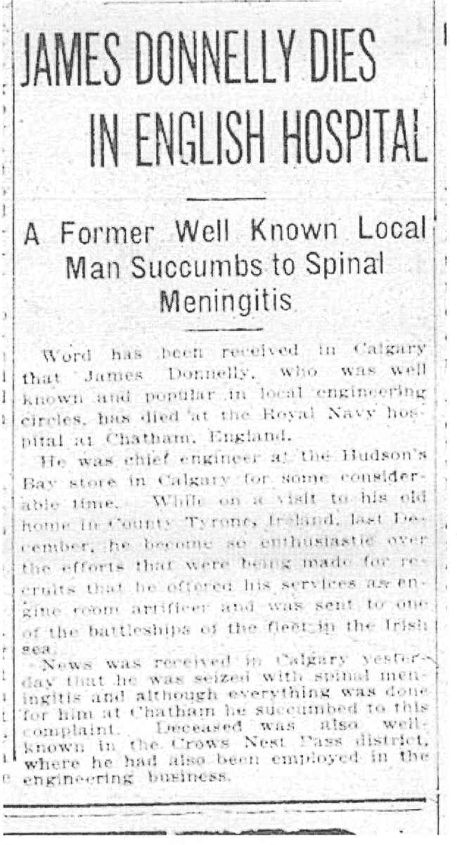 Son of Owen and Mary Donnelly, of Altaglushan, Cappagh, Pomeroy, Co. Tyrone, Ireland. Formerly an employee of Hudson`s Bay Store in Calgary, Alberta and while on visit to his former home in Tyrone, Ireland. While visiting he was overwhelmed with the work being done for the recruits, he offered his services as Engine Room Artificier and was sent to one of the battle ships of the Fleet in the Irish Sea.