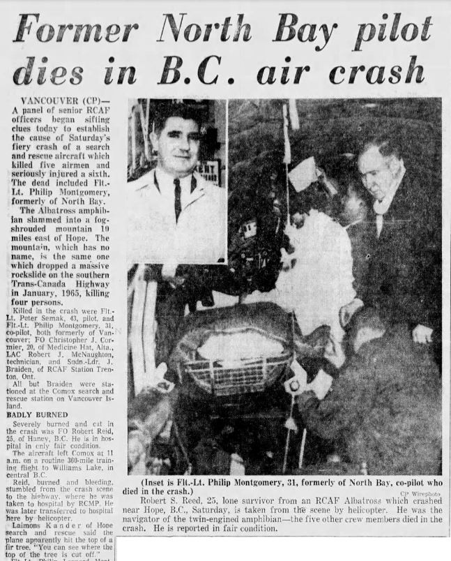 Son of Thomas and Ethel Montgomery of Toronto, ON. Husband of Mary Anne Montgomery of Comox, BC. Father of Holly Montgomery.A memorial service was held at Hope Slide, viewing platform on the 60th anniversary of the crash of Albatross rescue aircraft commemorating five members of the Canadian Forces who lost their lives when the plane crashed into the side of the mountain, just east of Hope, about 140 km from Vancouver, British Columbia. Captain (retired) Robert Reid the only survivor of the crash attended the ceremony.