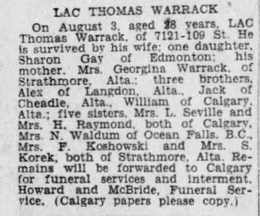 Son of John and Georgina of Strathmore, Alberta. Husband of Nora (nee Scollen). Father of Sharon Warrack of Edmonton, Alberta.