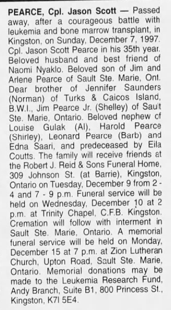 Son of James Arthur and Arlene Pearce of Sault Ste-Marie, Ontario. Husband of Naomi Nyakio (nee Kitamuni) Pearce of Kingston, Ontario.