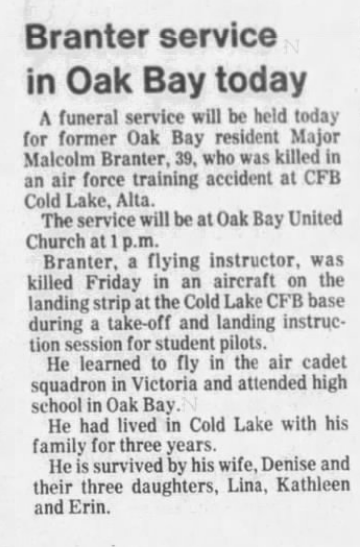 Son of Jessie Elinor (nee Main) and Donald Keith of Victoria, British Columbia. Husband of Denise Marie-Laure (nee Gagnon) Branter and father of Lina, Kathleen and Erin Branter of Grand Centre, Alberta.