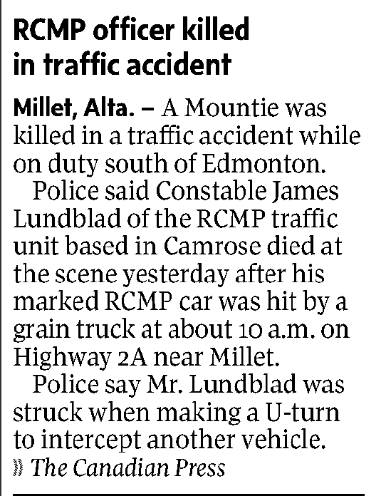 Son of Lloyd and Noella of Valleyview, Alberta, Cst. Lundblad enjoyed playing the trumpet and always dreamed of being a member of the Force. Prior to joining the Force he joined the Canadian Army Reserves and had worked for Brinks. Cst. Lundblad earned a diploma in power engineering from Grande Prairie College and completed a two year policing course at Lethbridge College. He served at Edson and Camrose Detachments in Alberta. He enjoyed being on highway patrol. On the day of his death, Cst. Lundblad saw a traffic violator. As he made a U-turn to go after the driver, the police car was slammed on the driver’s side by a grain truck. Cst. Lunblad is buried in Valleyview.