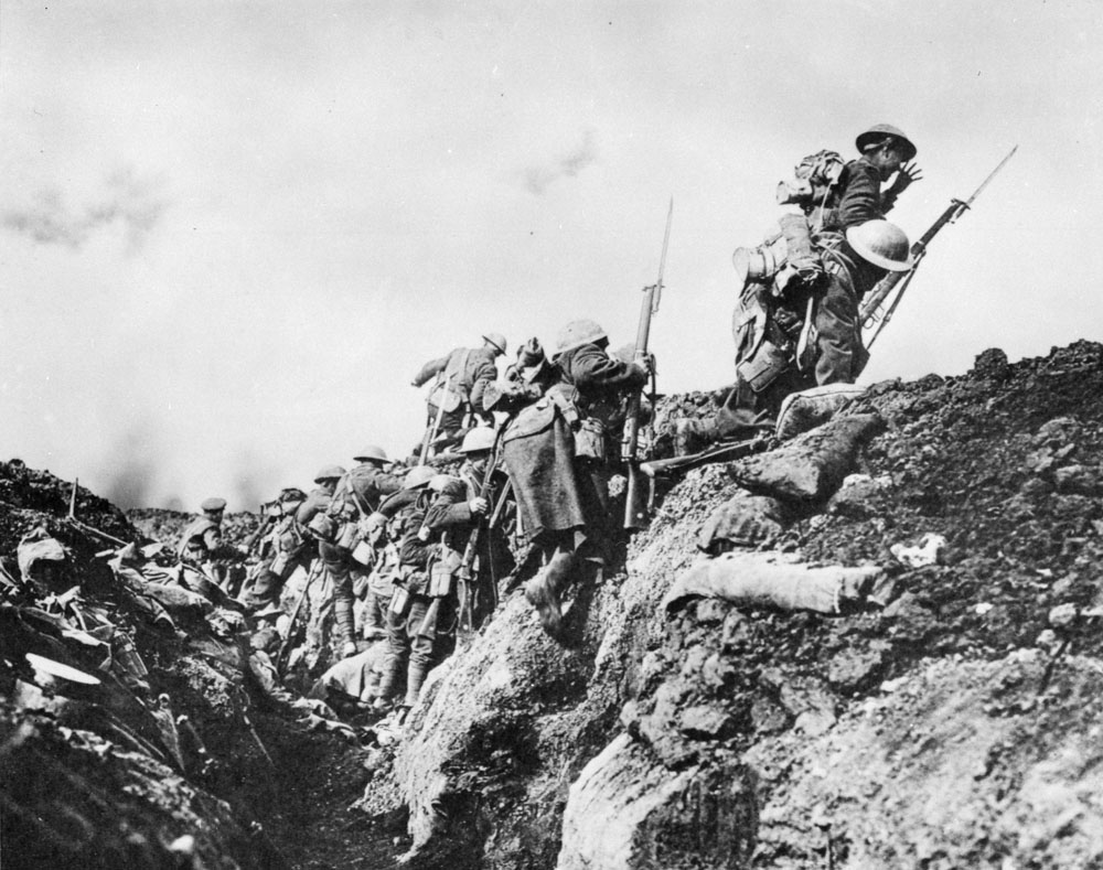 The phrase "over the top" describes the process whereby infantrymen climbed up the side of their trenches and ran into No Man's Land to attack the opposing enemy trenches. Since the soldiers were exposed to the enemy’s machine-gun fire, such action usually resulted in high casualties.