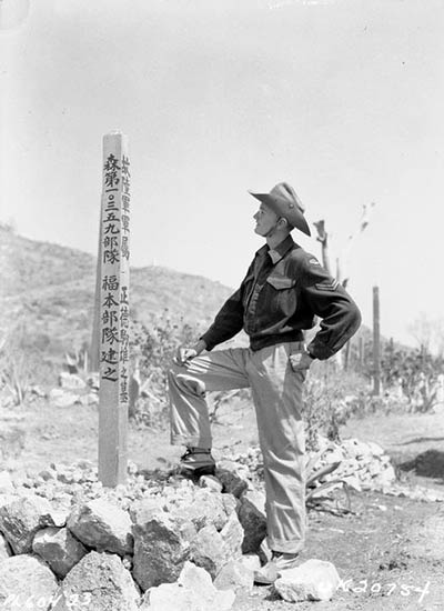 Cpl. Henry Schellinok of Eldersley, Sask., examines one of the headstones in a Japanese cemetery at the foot of Temple Hill, scene of some bitter fighting on the outskirts of Mandalay. April 19, 1945. Photo: Department of National Defence PL 60423