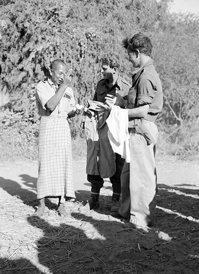 Burmese are hard up for clothing after three years of Japanese occupation and will barter chickens, eggs, etc. for old shirts and trousers. Trading shirt for eggs are Spitfire pilots. No. 155 (RAF) SQN. February 26, 1945. Photo: Department of National Defence PL 60252