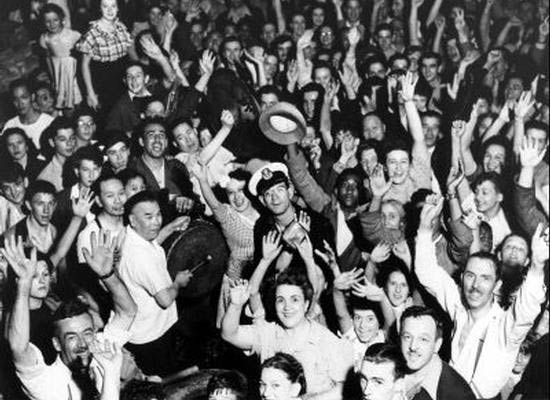 À Montréal, un tambour célèbre le jour de la Victoire sur le Japon avec la foule (le 15 août 1945). Photo : Archives nationales du Canada PA-112810