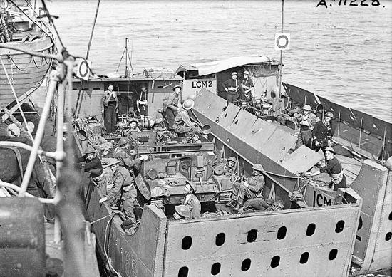 Soldiers and armoured vehicle preparing to go ashore during the Dieppe Raid. Photo: Library and Archives Canada PA-183767