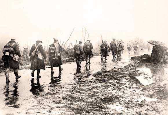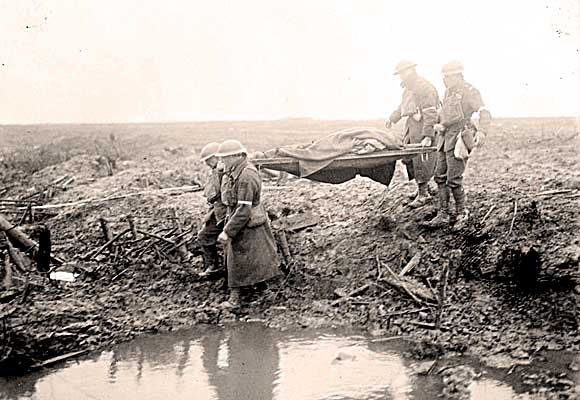 Caption: Wounded Canadians on way to aid-post. Battle of Passchendaele. November, 1917