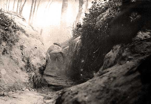 Caption: Shell bursting in a trench, injuring an unidentified member of the 5th Battalion, C.E.F. France. Aug 1916.