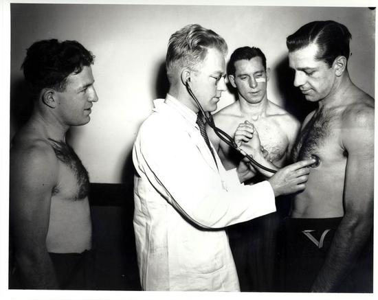 Boston Bruins Hockey Club front line Bobby Bauer, Porky Dumart and Milt Schmidt, who left hockey to become members of the RCAF, seen taking their medicals in 1942.