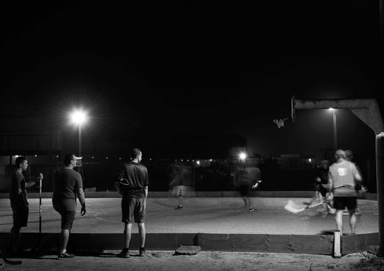 Members of Air Task Force - Iraq take part in a ball hockey game at Camp Patrice Vincent, in Kuwait during Operation IMPACT in 2015.