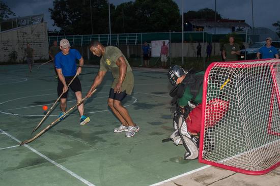 Members of the Royal Canadian Air Force play ball hockey with colleagues from other countries during a multinational exercise in Brazil in 2013.