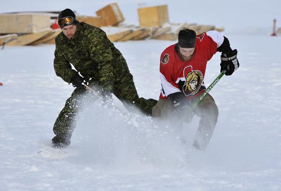 Leading Seamen Zurbriggen and Green fight for the hockey ball during Operation NUNALIVUT 10 Sports Day in CFS Alert in 2010.