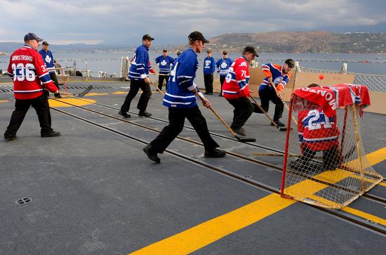 Ball hockey game on HMCS Toronto in the port of Chania, Greece during Operation REASSURANCE in 2014.