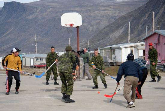 Soldiers from Eastern Ontario's 33 Canadian Brigade Group participate in a ball hockey game, with residents of Pangnirtung in Nunavut in 2008.