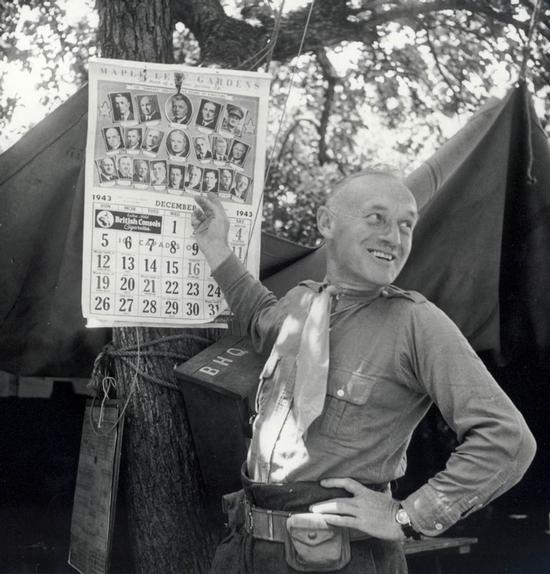 Major Conn Smythe, RCA, pointing out portraits of members of the Board of Directors of Maple Leaf Gardens on a Gardens calendar in France in 1944.