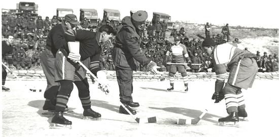 Our Canadian service members’ love of blending hockey with military service would continue in the Korean War. As the conflict progressed and the front lines became more stationary, our soldiers would find a way to play hockey in the Far East. During the colder months, they would clear the snow covering the ice on the Imjin River and play as the sound of artillery fire boomed in the distance.