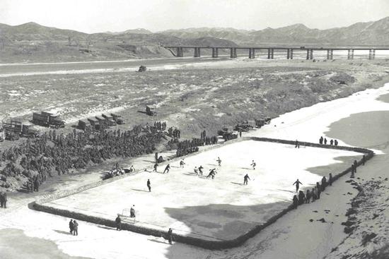 Some 400 spectators watch the 26 Canadian Infantry Brigade championship hockey game at Imjin Gardens in Korea in 1953.