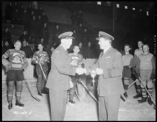Aircraft Commanding Officer O'Brien at hockey game in 1944.