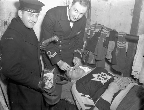 Sub-Lieutenant Fritz, of the Royal Canadian Navy hockey team, injured during a game in Halifax, Nova Scotia, in 1943.