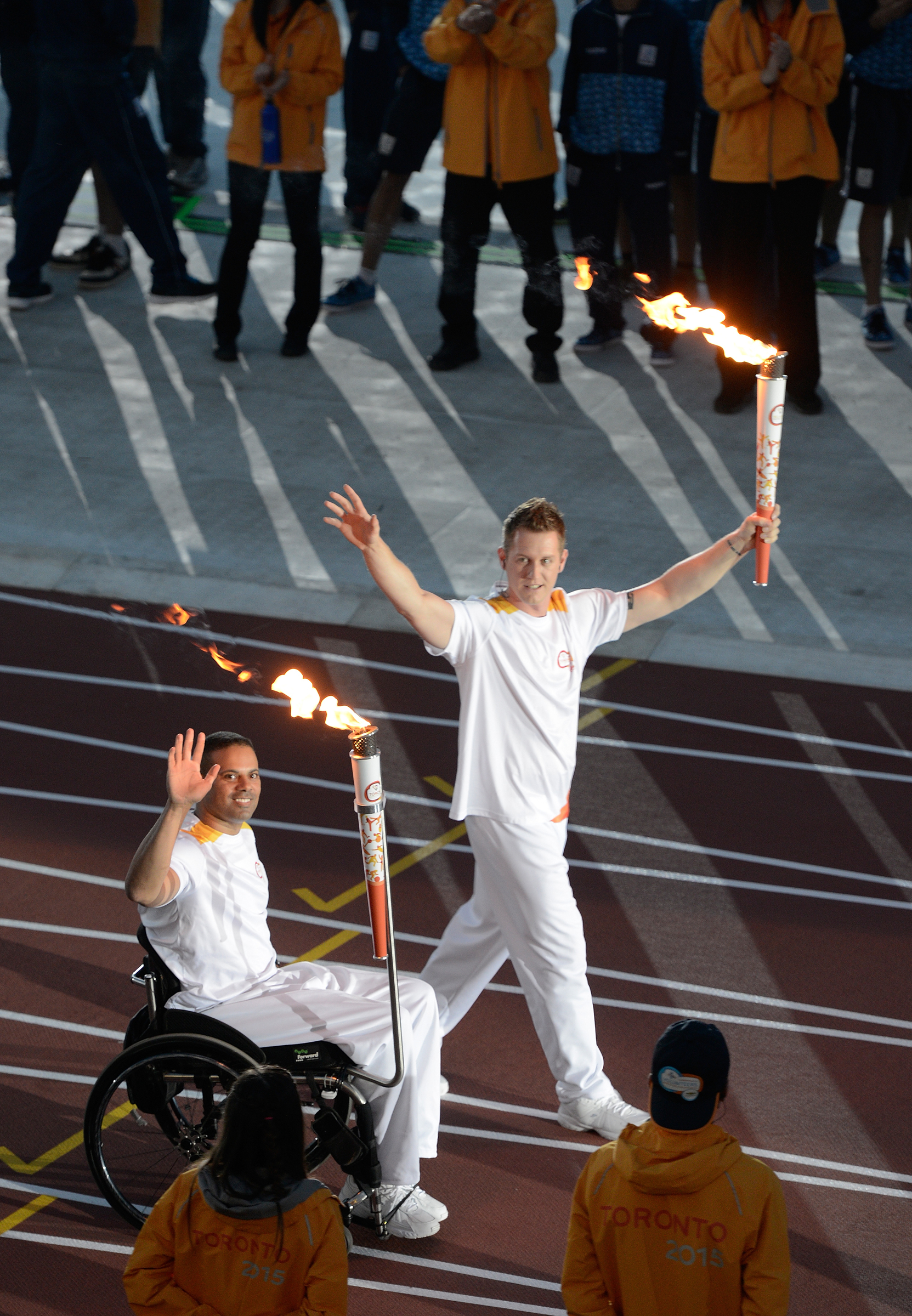 Steve Daniel and Dominic Larocque carry the flame into the stadium during the Opening Ceremonies for the Toronto 2015 Parapan American Games.