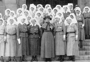 When Britain declared war on the German Empire, Canada was automatically compelled to fight alongside Britain in the Great War of 1914-18. At the beginning of the war there were five Permanent Force nurses and 57 listed in reserve. By 1917, the Canadian Army Nursing Service included 2,030 nurses (1,886 overseas) with 203 on reserve. In total, more than 2,800 Canadian nurses volunteered their services. Because of their blue dresses and white veils they were nicknamed the "bluebirds," and for their courage and compassion they received the admiration of many soldiers.