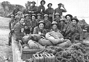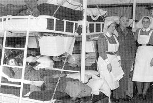 The army sisters, after training in Canada, were the first to go overseas, where they joined units which had preceded them to the United Kingdom. With the soldiers going overseas, the sisters travelled by ship in large convoys, running the perilous gauntlet of German submarine action in the North Atlantic. Upon arrival in England, they worked in the Royal Canadian Army Medical Corps’ hospitals at Taplow, Bramshott and Basingstoke. To illustrate the demands of their work, following the Dieppe raid, the hospital at Basingstoke received more than 600 casualties and in one 19 1/2 hour period, 98 operations were performed. The surgical staff took only a few minutes’ break to rest between operations.