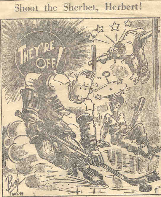 Many young soldiers had dreams of the NHL, so Bing Coughlin made a cartoon of Herbie in hockey gear. It was probably every Canadian's dream of that era to play in the NHL and Herbie was that dream. Herbie was part and parcel of every Canadian in Italy. He did all the things that could and did happen to us over there, each of us saw some bit of Herbie in ourselves.
