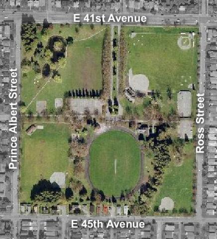 History - Originally known as Wilson Park (West 41st Avenue was known as Wilson Road at the time) this site was acquired by tax sales and was part of the South Vancouver Municipality before the City was amalgamated in 1929. Municipal Engineer E. Dundas Todd designed the park as a memorial to soldiers who perished in the First World War. Vancouver's first Cenotaph, located at South Vancouver Municipal Hall was relocated to the park later on November 11, 1939. The new park was officially opened on May 22, 1926. For many years the park played host to whippet racing but the most exciting event had to be an emergency plane landing on the football field during the Second World War. It seems the trainer plane from the No. 18 Elementary Air Training School at Boundary Bay had gotten off course, was low on fuel and had to make a forced landing. (Refer to memorial number 59027-001)