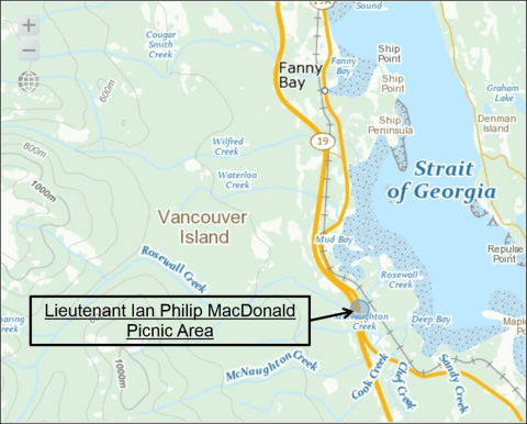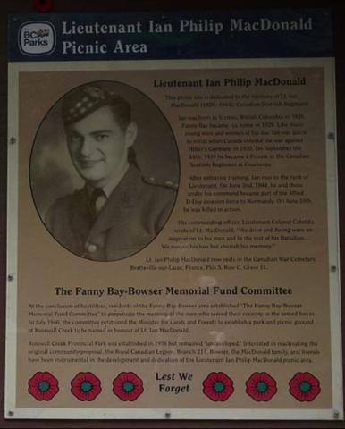 The Lieutenant Ian Philip MacDonald Picnic Area is named in honour of Lt. Ian MacDonald, Canadian-Scottish Regiment. It is on the grounds of Rosewall Creek Provincial Park, and was named on September 9, 1995 by British Columbia Parks.