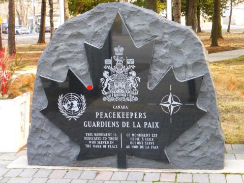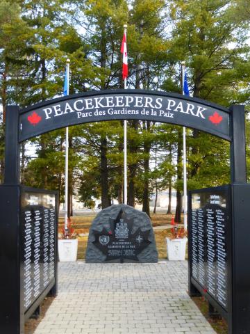 In 2008, this land was leased from the township by the Jerry Tremblay, CD, Central Ontario Chapter, Canadian Association of Veterans in United Nations Peacekeeping. A solid granite commemorative stone was imported from Pakistan and a maple leaf carved into its face in honour of all who served in peace. Peacekeepers Park is dedicated to the 160,000+ Canadians who have served on United Nations sanctioned missions since 1947.