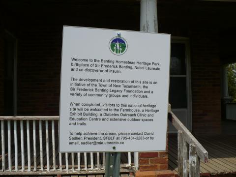 In 1975, a cairn was erected on the Banting property to mark the birthplace of Sir Frederick Grant Banting. In 2008, the Town of New Tecumseth purchased the property and named it the Banting Heritage Park. The farmhouse officially opened to the public at the annual Banting Day/World Diabetes Day celebration held on November 10, 2012. A new Heritage Exhibit building was completed and officially opened on Banting Day, November 9, 2013. The park includes interior exhibits and a Banting Legacy exercise trail.