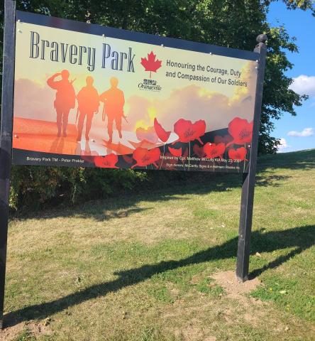On September 3, 2021, Bravery Park was officially opened by the Honourable Elizabeth Dowdeswell, Lieutenant Governor of Ontario, and included a flyover by the Canadian Snowbirds and an 80-member military parade. View a short video of the opening at Orangeville’s Bravery Park pays tribute to Canadian soldiers.