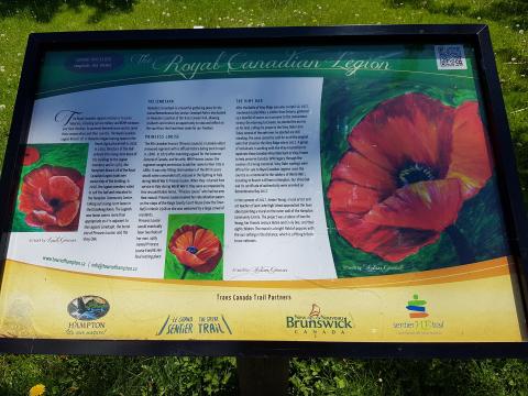 In the summer of 2017, Amber Young, a local artist and art teacher at Saint John High School approached the Town about painting a mural on the outer wall of the Hampton Community Centre. The project was a labour of love for Young, her friends Jessica Hickie and Emily Dee, and their eight children. The mural is a bright field of poppies with the sun setting in the distance, which is a fitting tribute to our veterans.