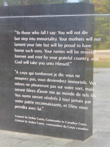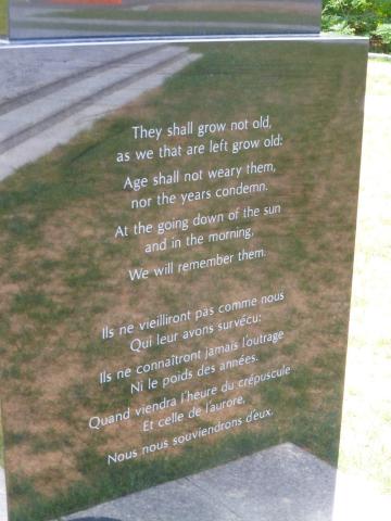 PAR ICI PASSENT LES FILS ET LES FILLES D'UNE NATION RECONNAISSANTE... ILS SERVENT LE CANADA AVEC HONNEUR, DEVOIR ET COURAGE, POUR QUE CHACUN PUISSENT VIVRE EN TOUTE LIBERTÉ, DANS LA DÉMOCRATIE ET LA JUSTICE.