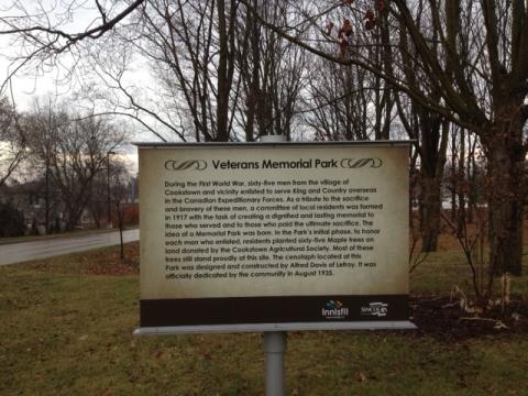 The Cookstown Veterans Memorial Park is a tribute to the 65 men from the village of Cookstown and vicinity who enlisted in the First World War. The cenotaph located at this park was officially dedicated by the community in August 1935.