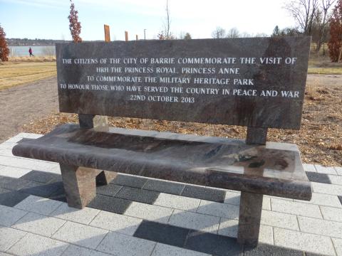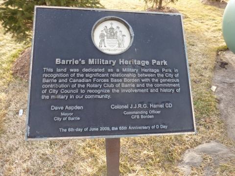 On June 6, 2009, this land was dedicated as a Military Heritage Park in recognition of the significant relationship between the City of Barrie and Canadian Forces Base Borden with the generous contribution of the Rotary Club of Barrie and the commitment of City Council to recognize the involvement and history of the military in our community.