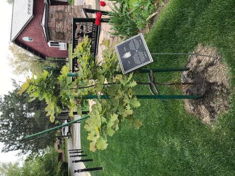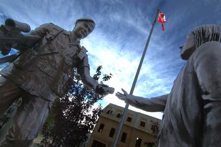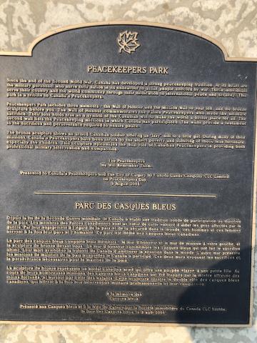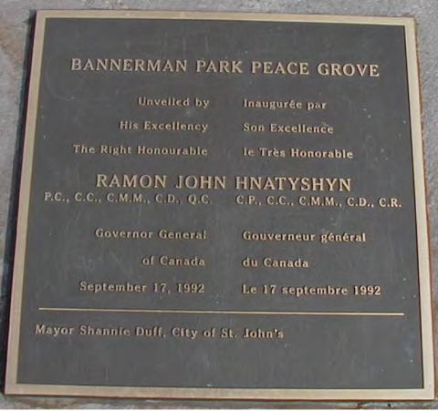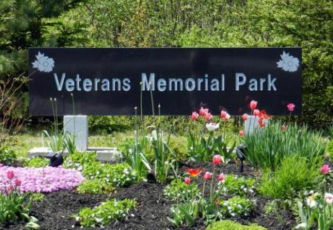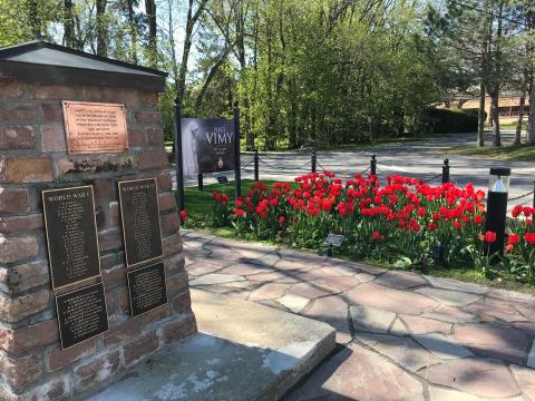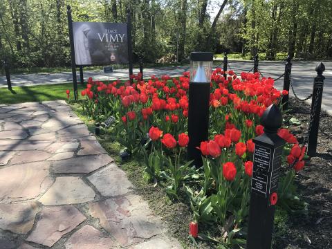 The Veterans Memorial Park (VMP) was designed by Dr. Karen Ewing in the form of a Celtic flower. The three gardens enfold eight black granite monuments set on red gravel. On the left is the Garden of Sorrows, formed as a mock WWI trench with no flowers and only black mulch and white sandbags. Behind the monuments is the Garden of Remembrance, with old-fashioned white and green shrubs, bulbs, perennials, and grasses. To the right is the Garden of Hope, in full colour, again filled with shrubs, bulbs and perennials from all around the world to inspire the visitors to look forward to the day when we will all live in peace with each other. The park is ringed by native trees with lawns and red gravel paths.