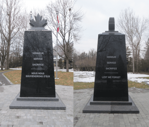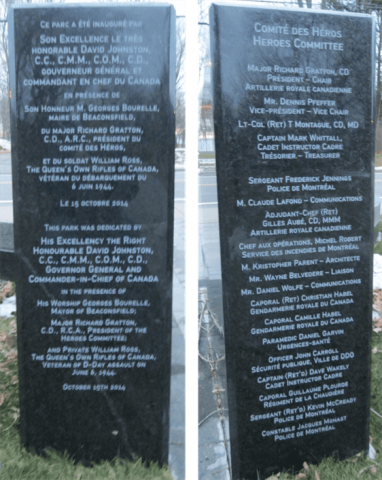 This par kwas dedicated by His Excellency the Right Honourable David Johnson, C.C, C.M.M., C.O.M., C.D., Governor General and Commander-in-Chief of Canada. In the presence of His Worship Georges Bourelle, Mayor of Beaconsfield, Major Richard Gratton, C.D., R.C.A., President of the Heores Committee, and Private William Ross, The Queen’s Own Rifles of Canada, veteran of the D-Day assault on 6 June 1944. October 15th 2014.