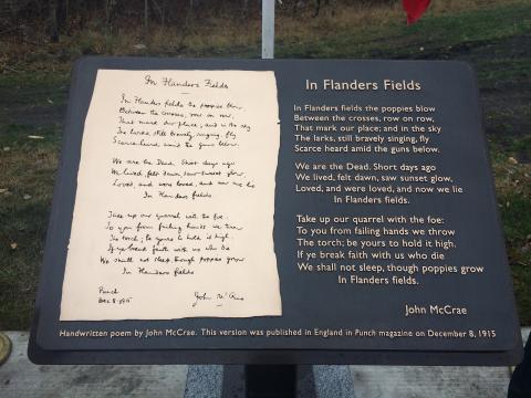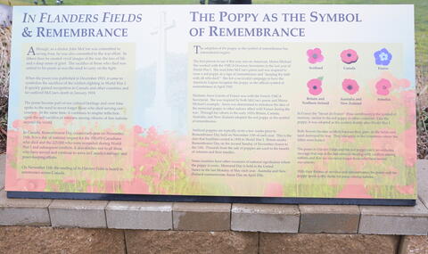 On November 1, 2015, the park was officially dedicated to commemorate the 100th anniversary of the famous war poem, In Flanders Fields. The park features unique walkways and walls made of brick which mimic the trenches in the First World War, poppy beds, a bronze plaque with the poem in the author’s original handwriting, a storyboard with the story of McCrae and how he came to write the poem and another storyboard with the story of how the poem itself became tied to remembrance and the poppy became the symbol of remembrance.