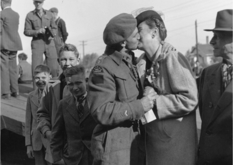 Shortly after Ortona, he was promoted to Lieutenant-Colonel and took over the battalion command in January 1945. In October 1945, he returned home to his family and sealed it with a kiss to his wife, while their three sons stood in the background. His homecoming was photographed and ran on page 5 of the Saskatoon Star Phoenix. The boys hadn’t seen their father since he returned to Canada in 1942 for an instructional tour. After the kiss, soldiers paraded through Saskatoon’s downtown with Drayton at the front, leading his troops one last time.