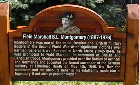Montgomery Park is named in honour of Field Marshall Bernard Law Montgomery, 1st Viscount Montgomery of Alamein, KG, GCB, DSO, PC. It is located in Montgomery Place, an area developed in 1946 to house returning Second World War Veterans and their families. Most streets and parks in the area are named for prominent military members, famous battles, and military units. A duplicate of this plaque is located at the Montgomery Place Memorial.