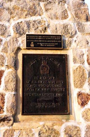 Dedicated a Peace Park on 4 June 1993, this memorial is marked by a fieldstone cairn erected by Royal Canadian Legion Branch No. 249. It is dedicated to Canada's war dead.