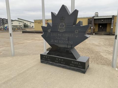 It is not known when it was replaced with the new memorial of black granite maple leaf on a horizontal base. Flags surrounding the memorial (left to right) are: Royal Canadian Legion, Nunavut, Red Ensign, Canadian, Union Jack, Nova Scotia and Lest We Forget. The Royal Canadian Legion crest, Royal Canadian Legion torch and a poppy with stem and leaves are etched on the front of the memorial.