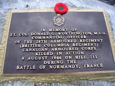 This mountain was named in honour of Lt. Col. Donald G. Worthington, commanding officer of the 28th Armoured Regiment (British Columbia Regiment) who was killed during the Battle of Normandy, 9 August 1944 in recognition of his leadership. On 11 August 2006, a plaque was installed on a large granite boulder adjacent to the trailhead at Upper Kananaskis Lake, facing Mounts Hart-McHarg (memorial no. 48025-044) and Worthington, for viewing by future hikers and climbers. Also, a four-inch ABS tube containing a signature book in a stone cairn on the upper slope of the peak was installed by a climbing team supplied by the British Columbia Regiment on 12 August 2006. A dedication ceremony was conducted on 13 August 2006.