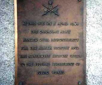 AT THIS SITE ON 1 APRIL 1964 THE CANADIAN ARMY HANDED OVER RESPONSIBILITY FOR THE ALASKA HIGHWAY AND THE NORTHWEST HIGHWAY SYSTEM TO THE FEDERAL DEPARTMENT OF PUBLIC WORKS